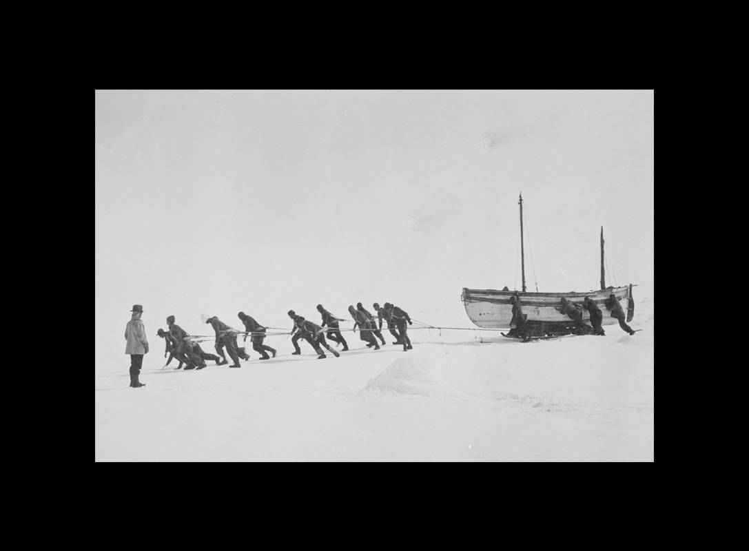Il disegno si rifà ad una delle fotografie originali che immortala la faticosa opera di trascinamento di una barca da parte degli uomini dell’equipaggio.